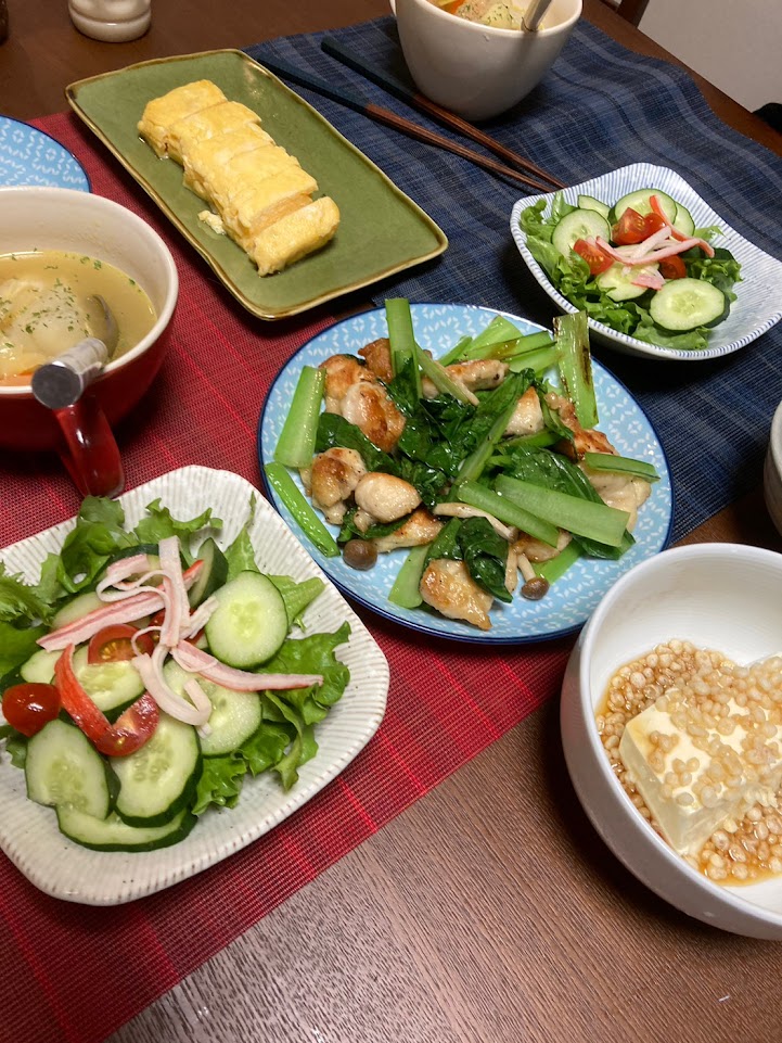 写真は今日の夕食です。卵焼き以外は妻が作ってくれました。感謝。